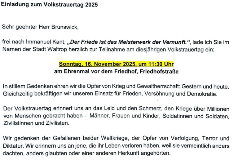 Am Sonntag, den 16. November, ist Volkstrauertag. Vorstand, Throngemeinschaft und Fahne werden an diesem Tag um 11 Uhr einen Kranz am Ehrenmal in Oberwiese niederlegen. Anschließend werden sie an der Gedenkfeier der Stadt Waltrop teilnehmen. Die Mitglieder und Freunde des BSV Oberwiese sind herzlich willkommen ebenso an beiden Veranstaltungen teilzunehmen.